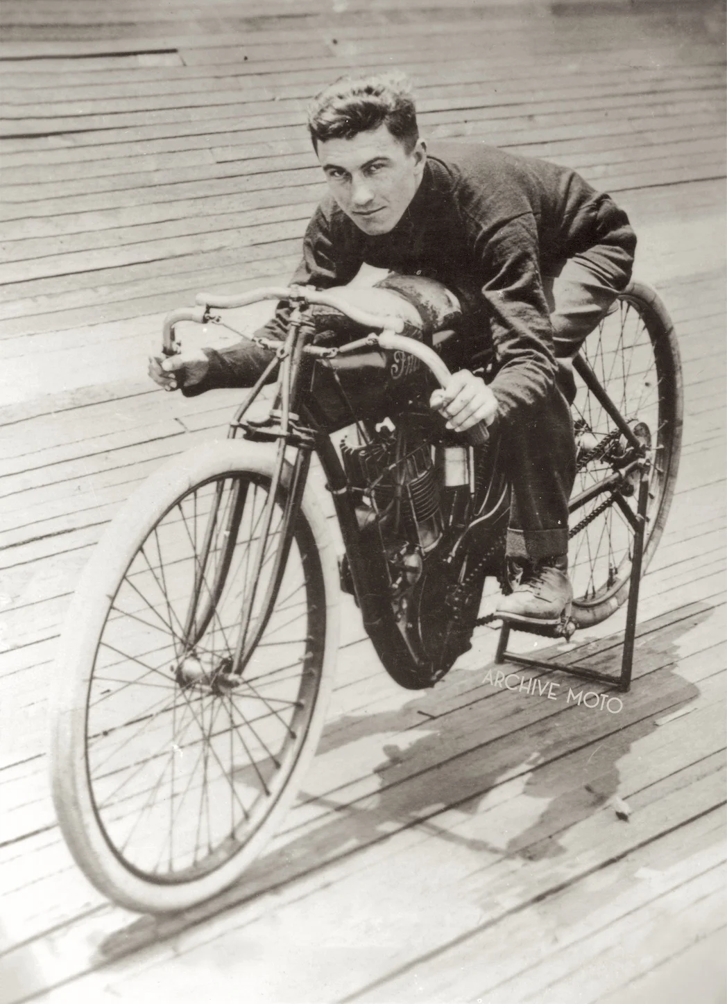 “Mine was not an office boy to president sort of racing career. Contrary to the experience of many racing men, I had not spent a lot of time on a motorcycle prior to the time I started racing. I rode first at the age of sixteen in 1906 and I started right out to race. Of course my early races were not victorious ones. But as I learned to ride and to control a machine I also learned to race. In those early days, before a mile-a-minute had become an actuality we used wood rims with bicycle spokes. They were really sulky rims. We also used open ports which would uncover about one half inch from the bottom of the stroke. The ports helped the escapement of gas and also helped to keep your legs warm. The valves in those machines were not so large as in later designs and the ports were considered quite a help.